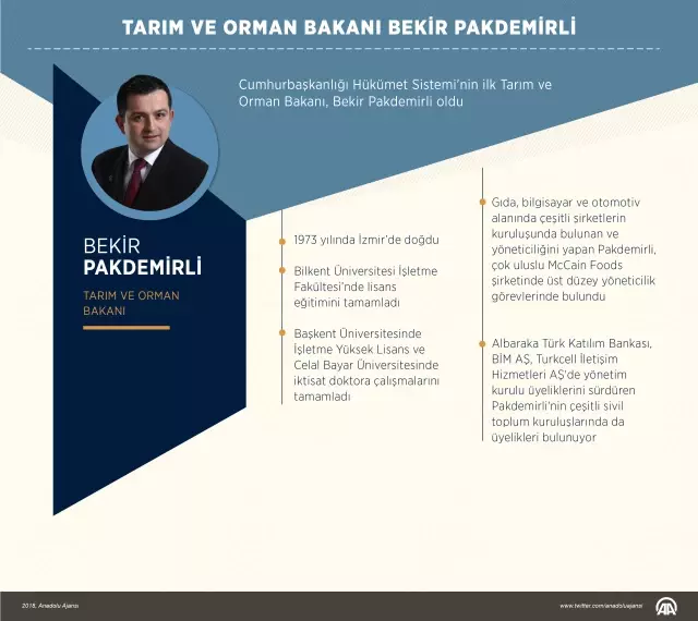 Yeni kabinenin tarım ve orman bakanı bekir pakdemirli olması ile hayatı merak edilmeye başlandı. Bilkent üniversitesi i̇şletme fakültesi'nde lisans eğitimini tamamladıktan sonra, başkent üniversitesi'nde i̇şletme yüksek lisansı. Tarım ve orman bakanı bekir pakdemirli kimdir, nereli, kaç yaşında sorularına vatandaşlar yanıt arıyor. Bekir pakdemirli was born at i̇zmir, turkey in 1973. Bekir pakdemirli (10 kasım 1973, i̇zmir, türkiye), türk ekonomist.